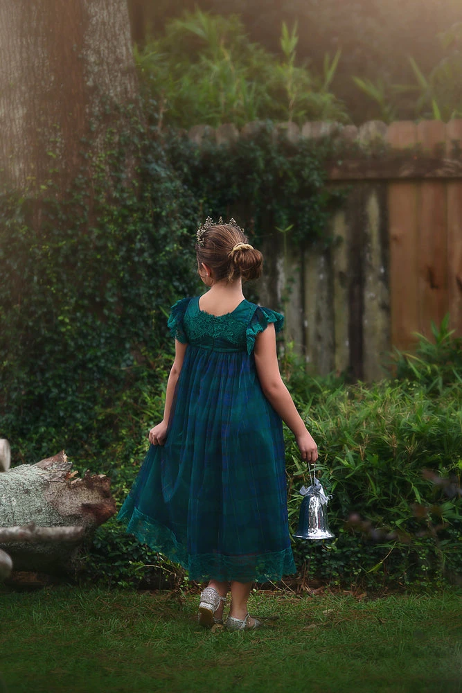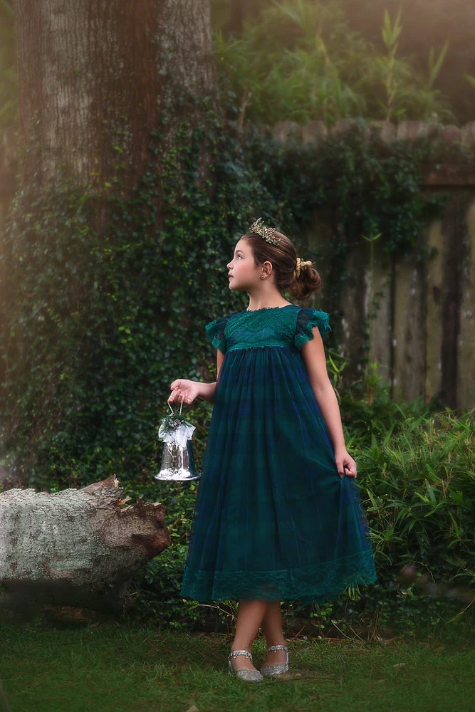 The dress has a tartan overlay with vintage inspired Chantilly lace trimmings, revealing the most gorgeous shade underneath.