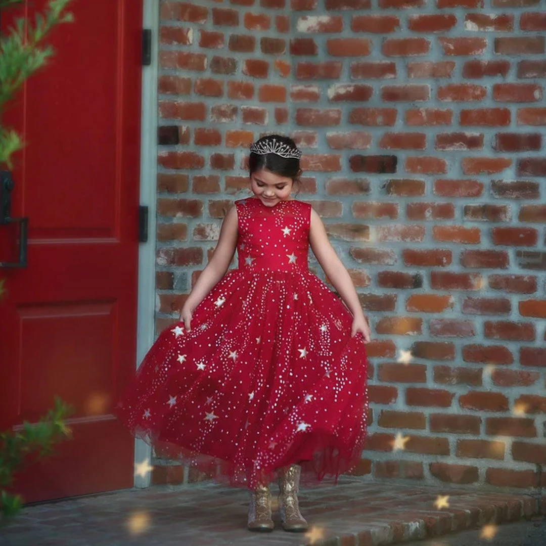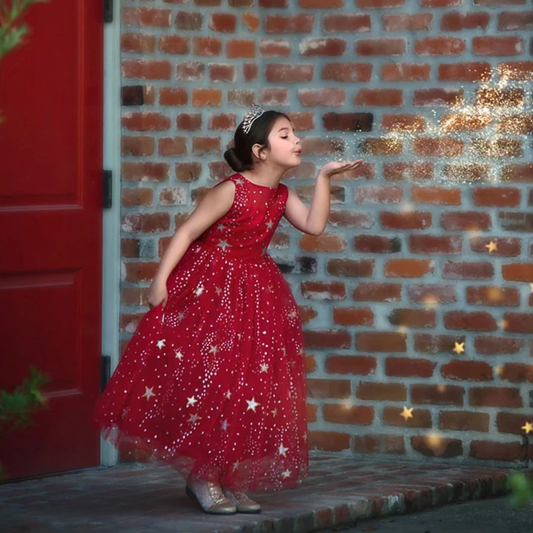 This gown will have all eyes on her! Stunning layers of navy blue tulling graced with a sweet, delicate sparkle star print, your girl will be spinning with excitement! Fully lined with soft cotton and lots of built in poof, this gown is both stunning and comfortable. Self ties and fully washable!
