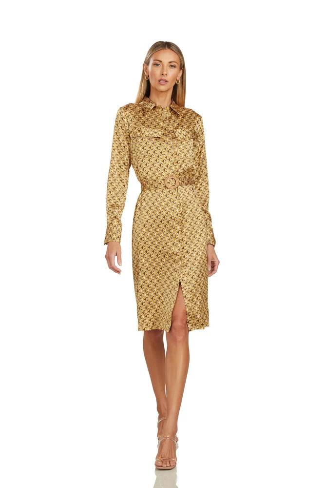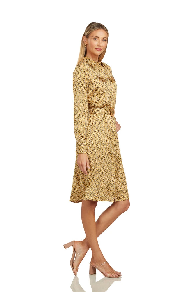 This button front golden frock has bodice flap pockets and finished off with a bamboo buckled belt.