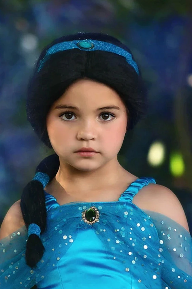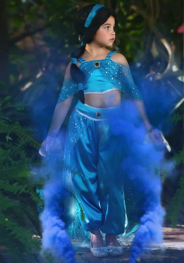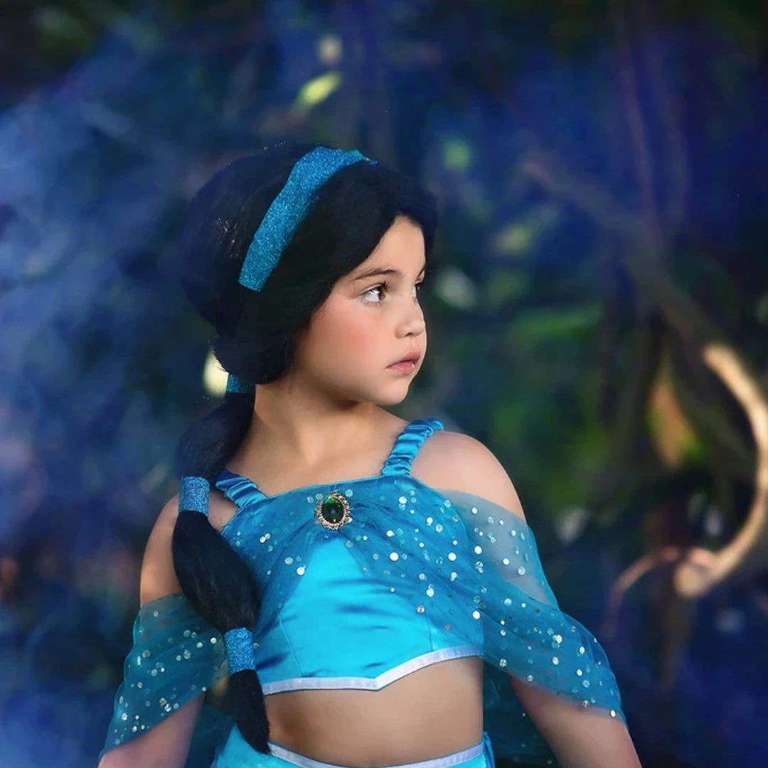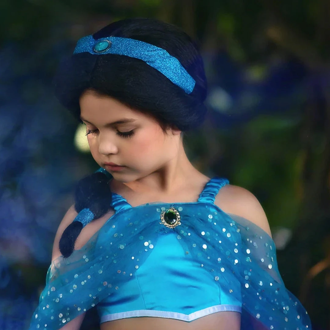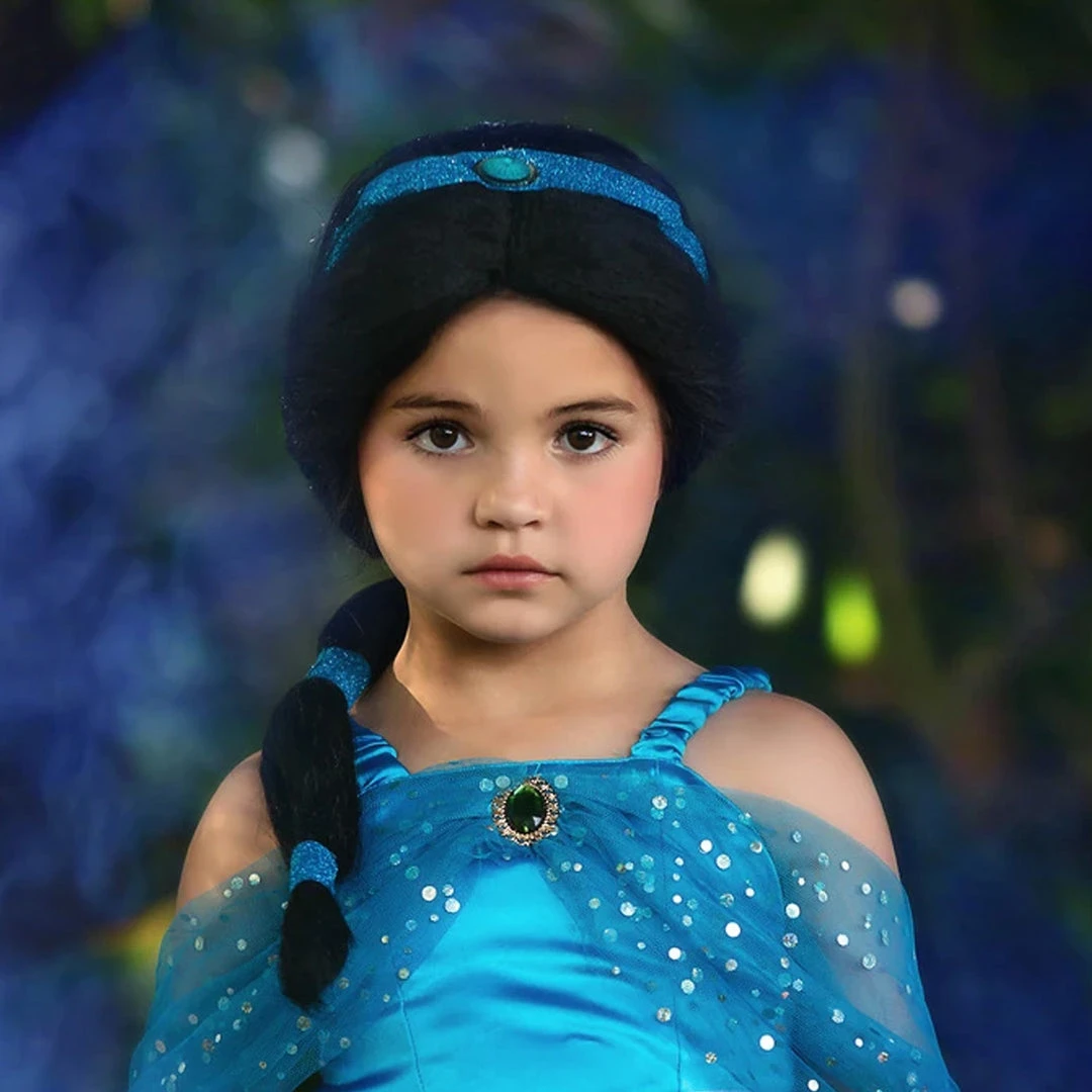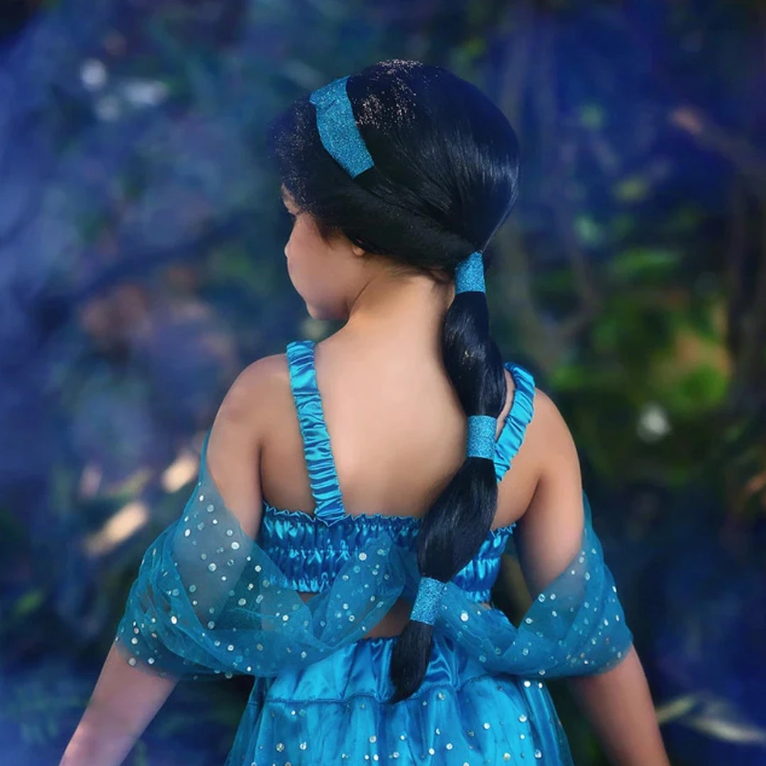 This brunette wig pairs perfectly with our Genie costumes! Long shiny stands are bundled by sparkly blue ties and finished off with a jeweled blue headband. This is so adorable, she will never want to take it off! Like all of our luxe dress up, these are high quality, heirloom pieces that will be enjoyed for years to come. 100% poly.