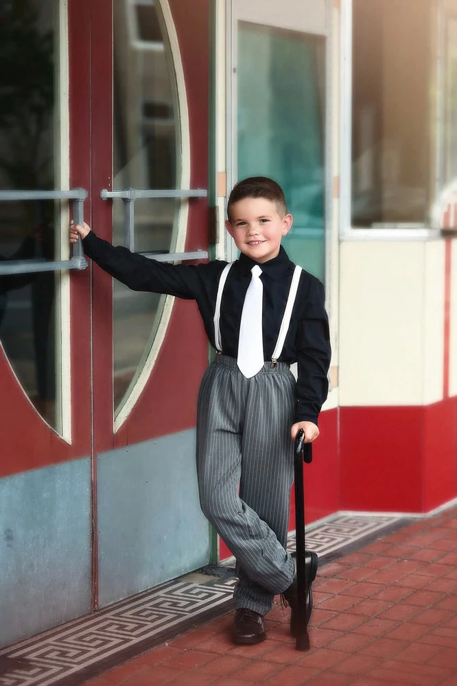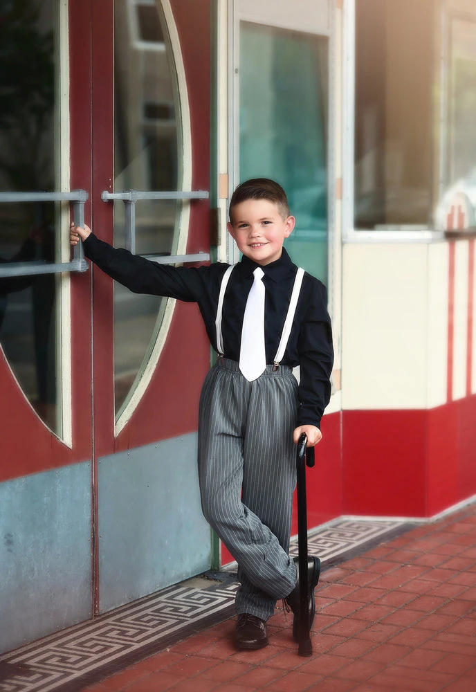 Mr. Zoot Suit will have all eyes on him! The 4pc. set is made up of the grey pinstripe pant, black button front shirt, white suspenders and white tie. Pair him with our Gatsby girls for the perfect squad photos!