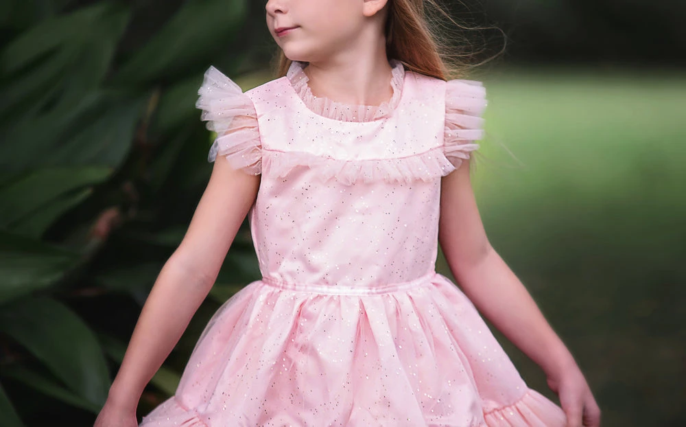 Lots of ruffles with a touch of sparkle, this dress has it all!