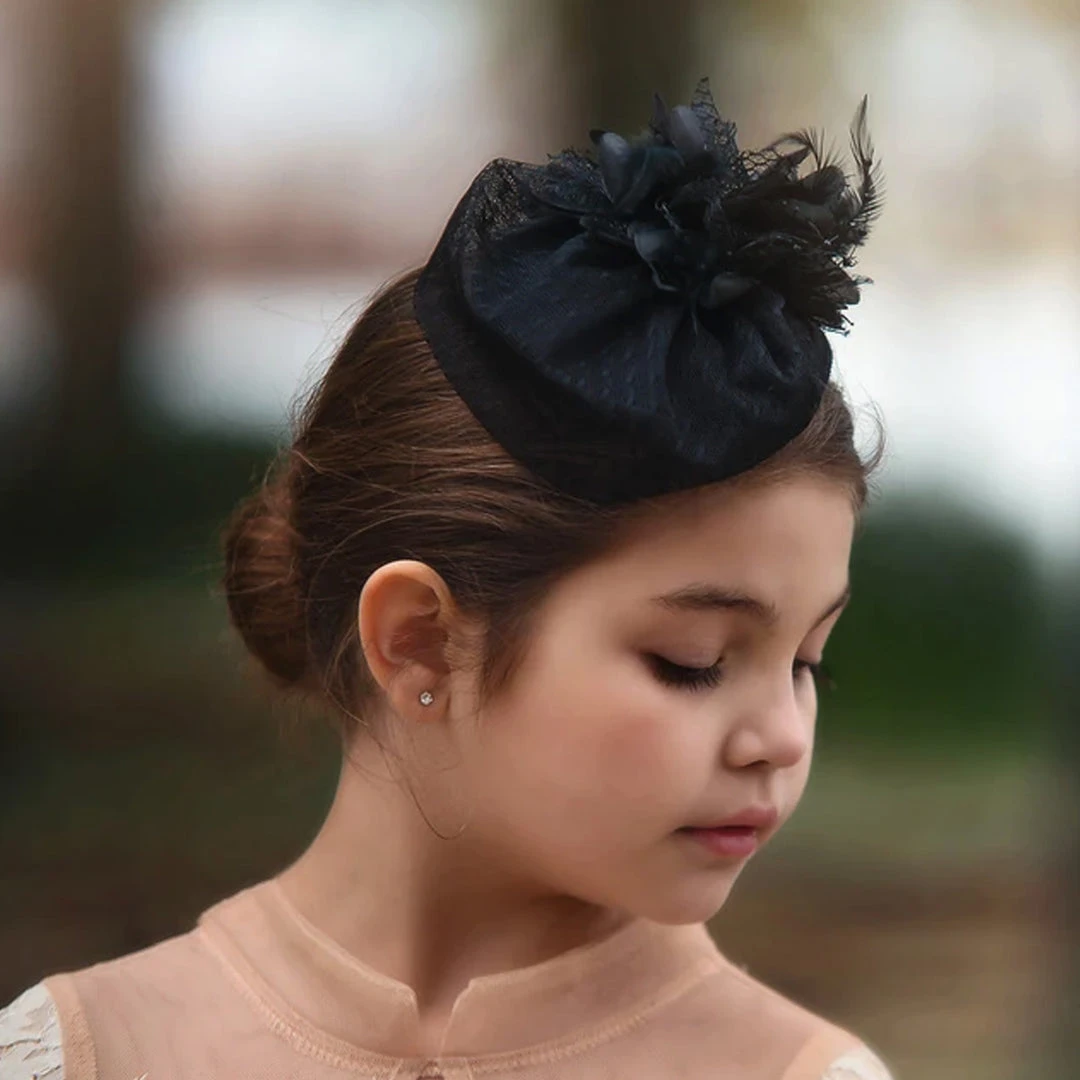 This darling black pillbox hat is the perfect addition to her outfit! A great addition to any photo shoot, this hat is outfitted with clips to secure it in place.