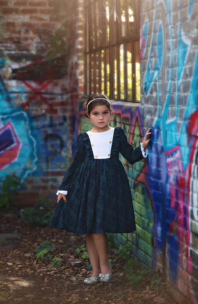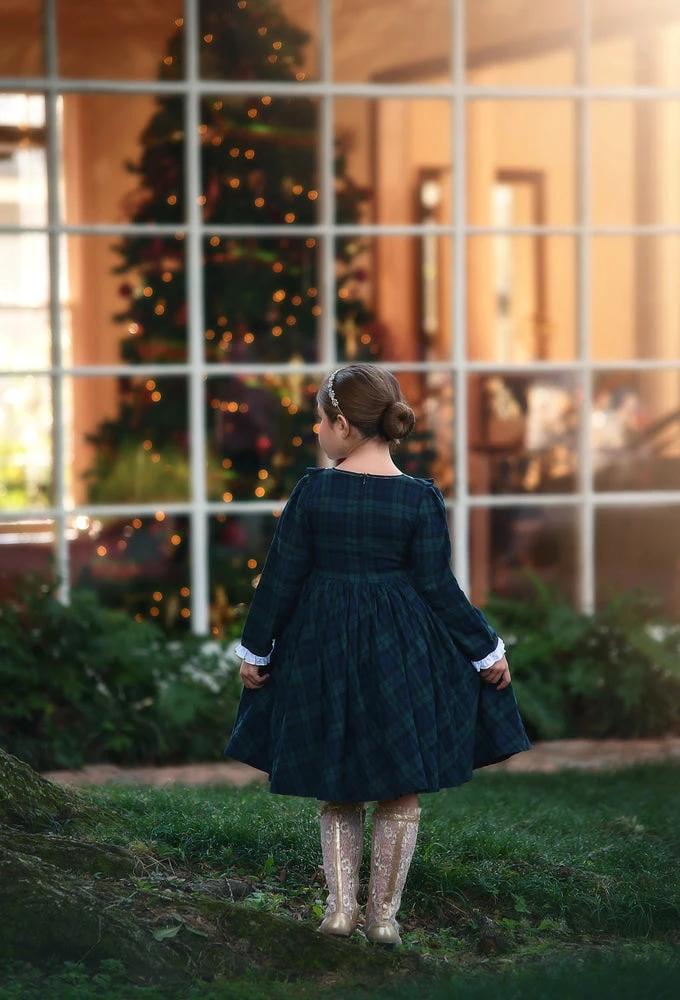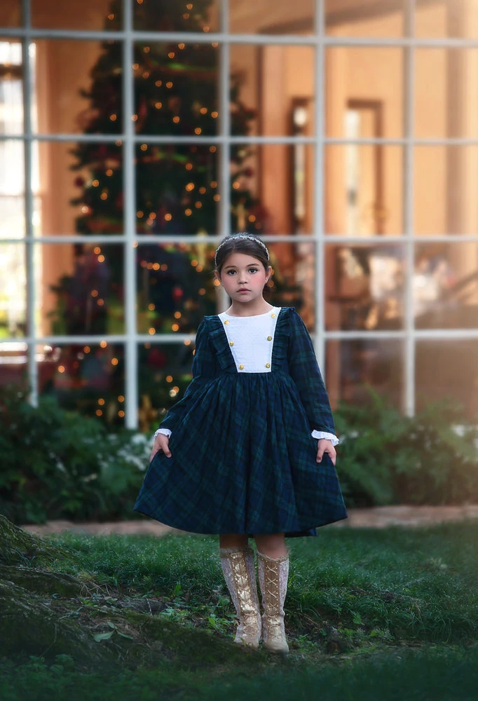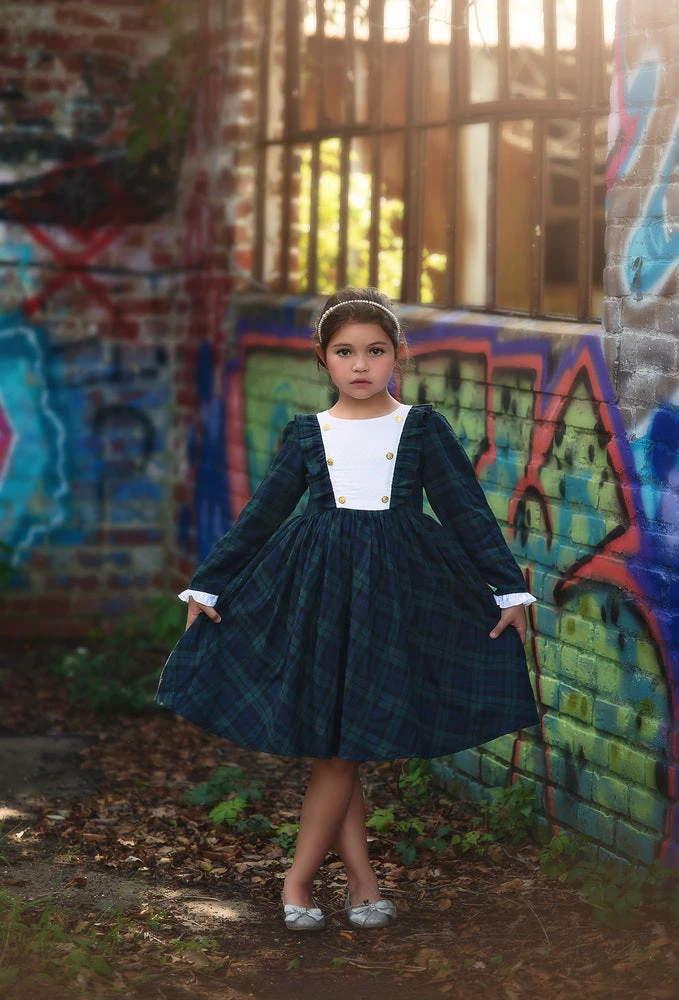 Ahhh the sweet traditions of a black watch tartan dress…this classic holiday print, reinvented with a touch of whimsy, will be the talk of all your gatherings. The bodice is detailed with a white Swiss dot, finished off with regal crested gold buttons, fit for a gathering at Windsor castle. Truly a keepsake passed down from generation to generation. 100% soft brushed cotton, fully lined with soft cotton and back zips. Machine wash, hang dry.
