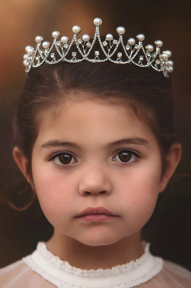 This tiara is a showstopper! A beautiful blend of pearls and rhinestones, in a metal setting, this tiara will not disappoint. While we show these on our child models, we have brides that love our tiaras, because they are THAT nice. Definitely a photographers dream to shoot.