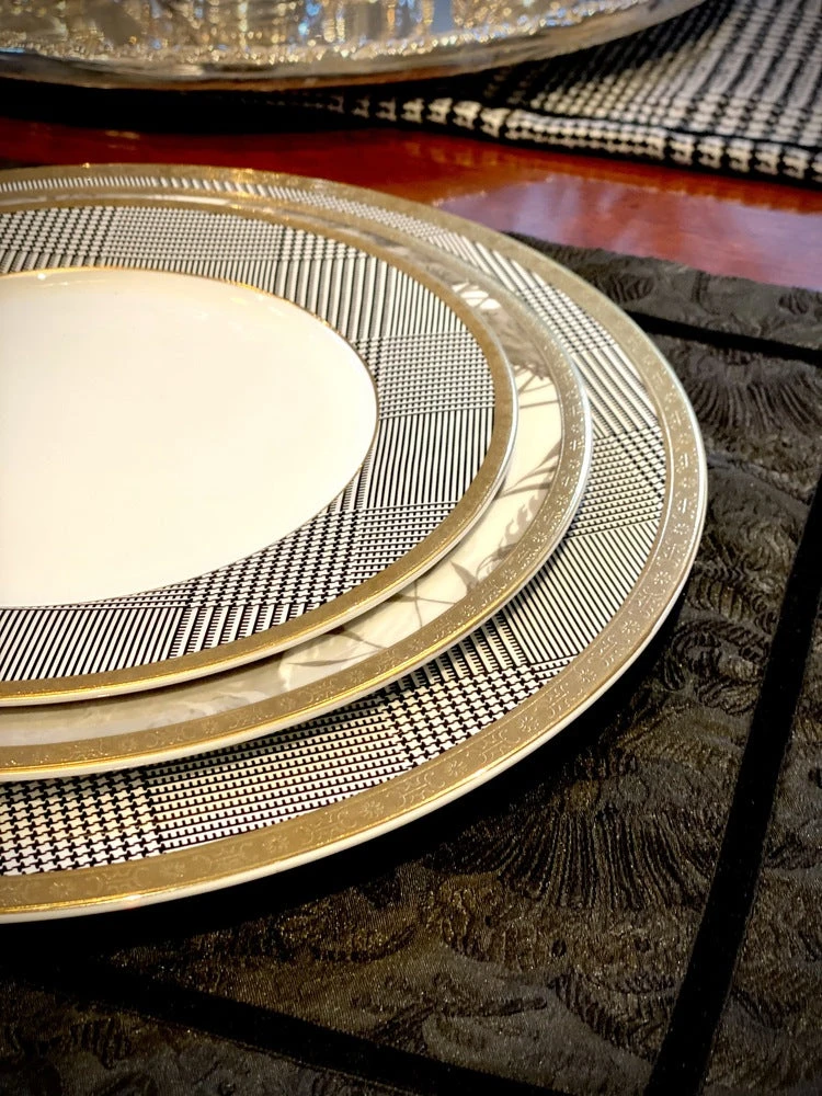 A black velvet trim border finishes off the look. Anchor them under your favorite bone china or take them to the patio for an alfresco dinner under the stars.