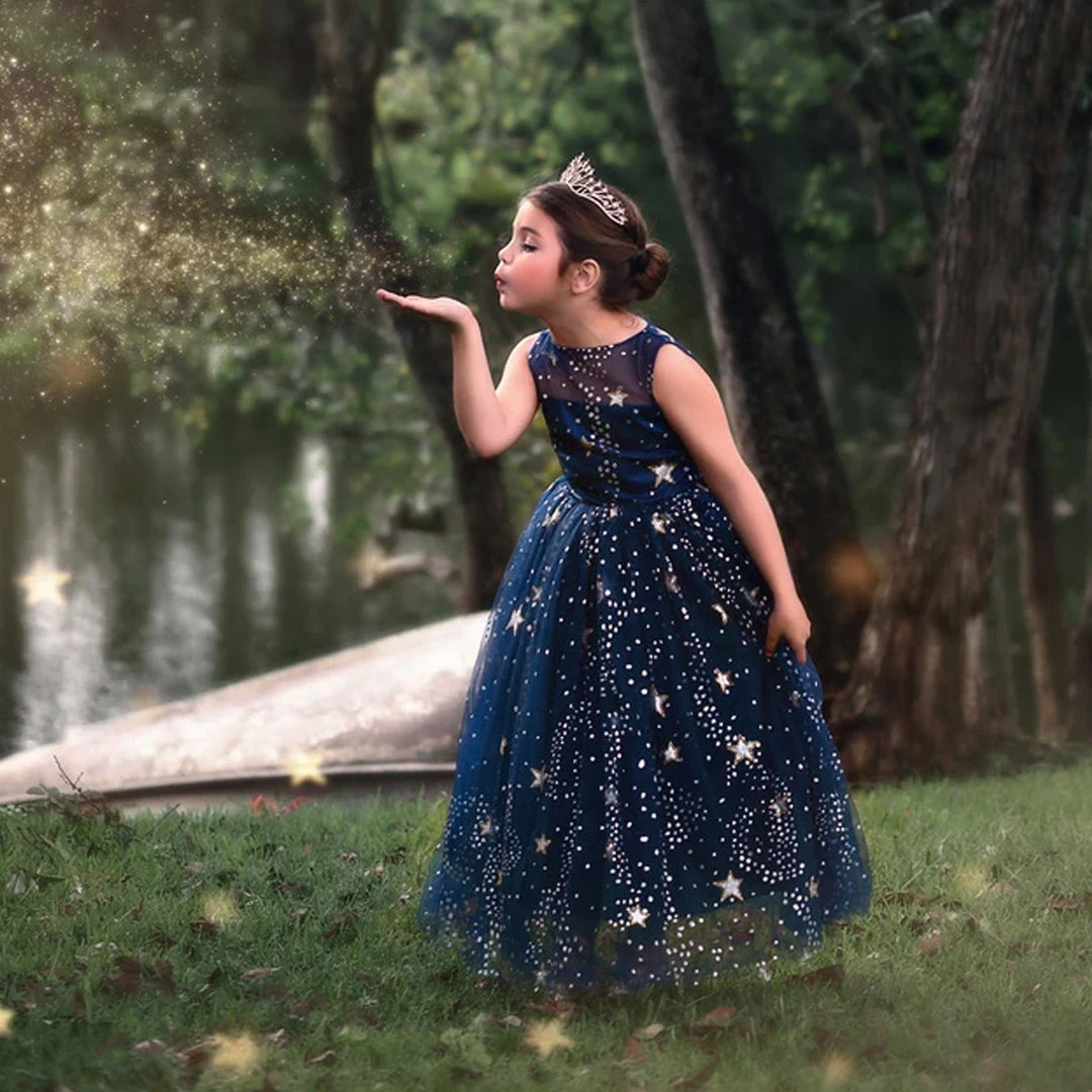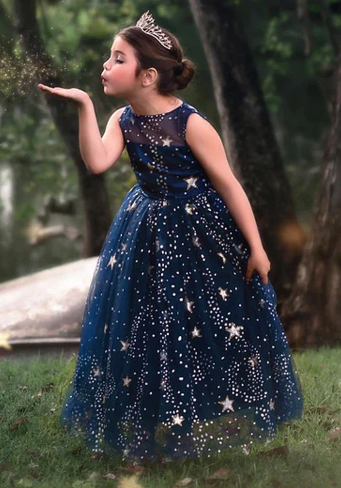 This gown will have all eyes on her! Stunning layers of navy blue tulling graced with a sweet, delicate sparkle star print, your girl will be spinning with excitement! Fully lined with soft cotton and lots of built in poof, this gown is both stunning and comfortable. Self ties and fully washable!