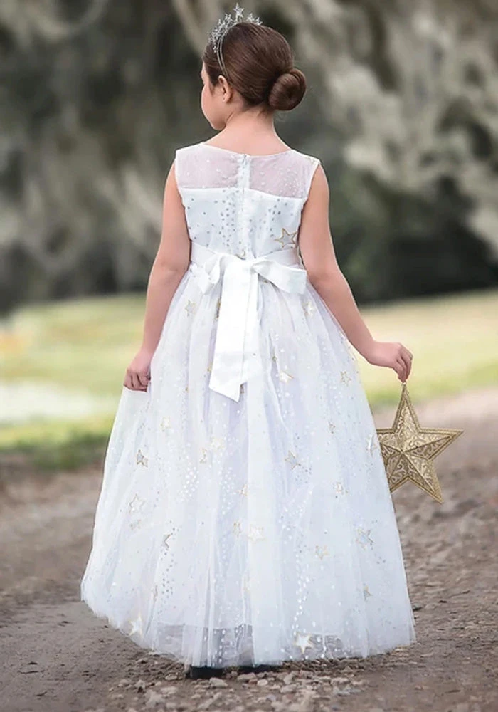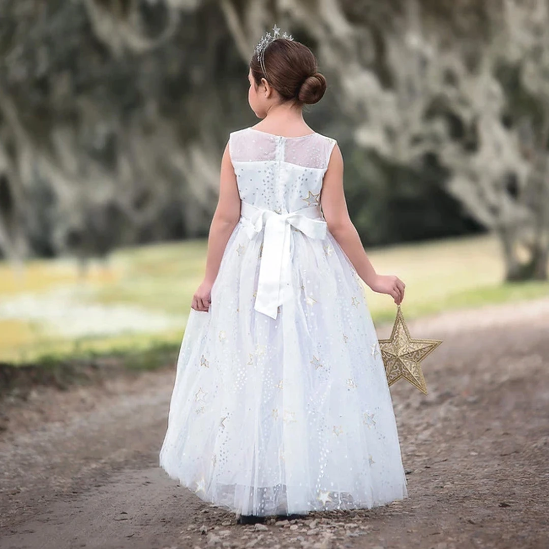 This gown will have all eyes on her! Stunning layers of white tulling graced with a sweet, delicate sparkle star print, your girl will be spinning with excitement! Fully lined with soft cotton and lots of built in poof, this gown is both stunning and comfortable. Self ties and fully washable!