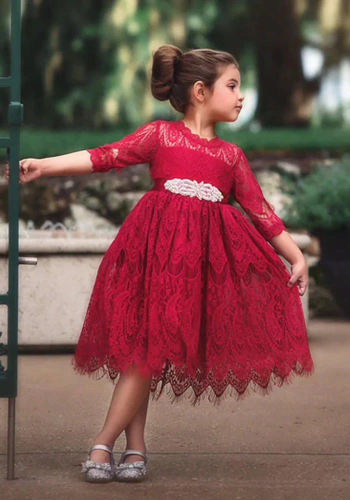 This vintage inspired lace frock is absolutely stunning in person. The color is a dreamy deep crimson and photographs amazing. The lace is soft, not scratchy and has a French eyelash edging, creating a touch of vintage whimsy. The dress is fully lined with soft cotton and has a back zipper. The sparkle belt is completely removable and self ties in back for just the right amount of glam. This color is gorgeous and will be a photographers dream to shoot. Machine wash, hang dry. WE RECOMMEND REMOVING THE BELT DURING ACTIVE PLAY. THE BELT CAN SNAG ON THE LACE AND CAUSE DAMAGE TO THE DRESS.