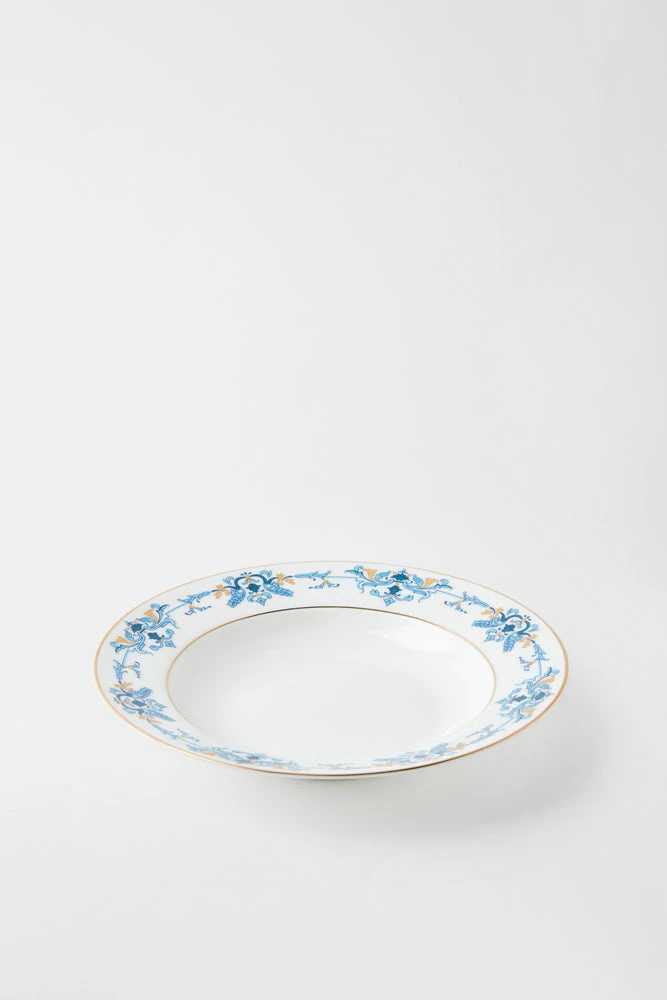 Hand decorated with a deep blue and gold Louis XIV motif embellished with a 22k gold rim, this bowl is pure elegance.