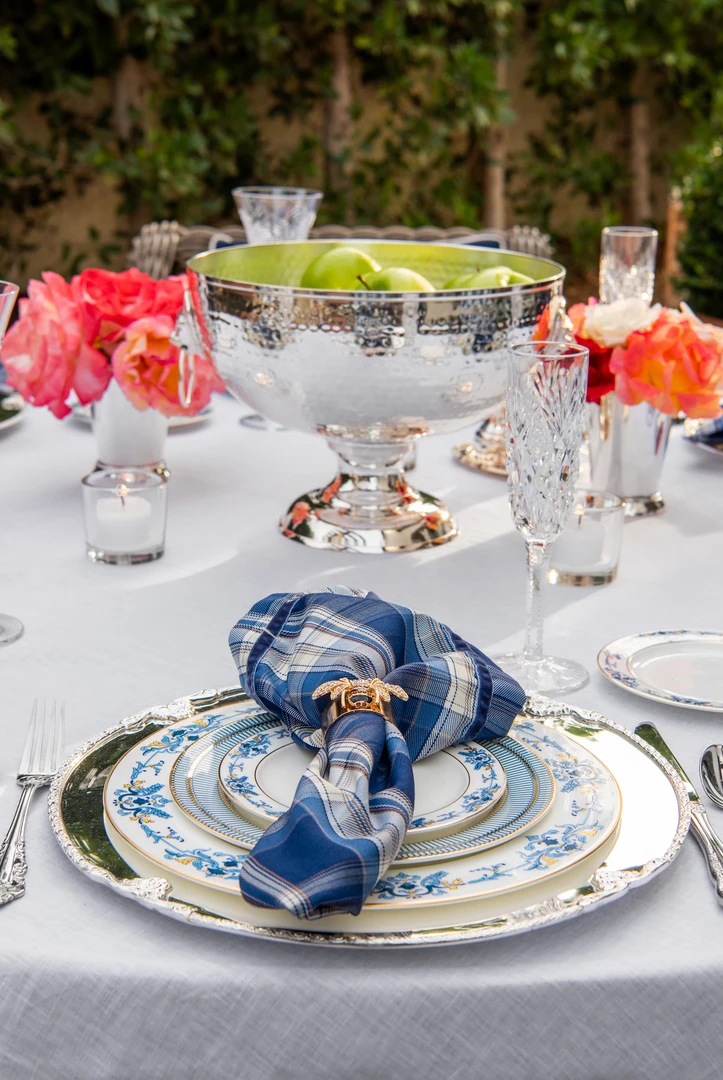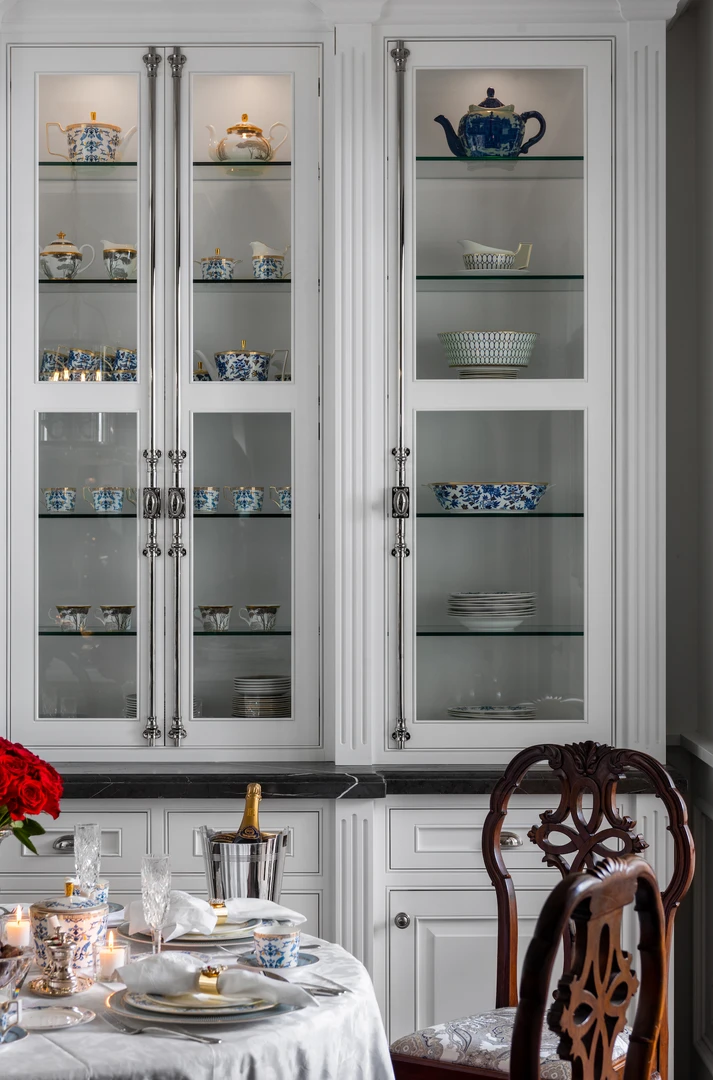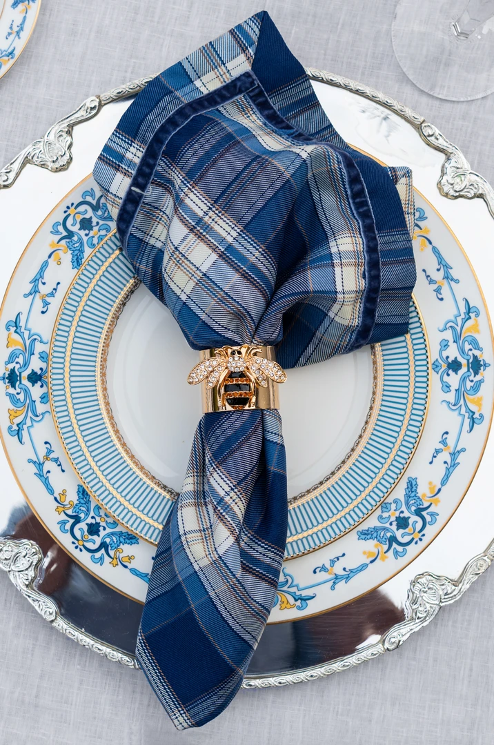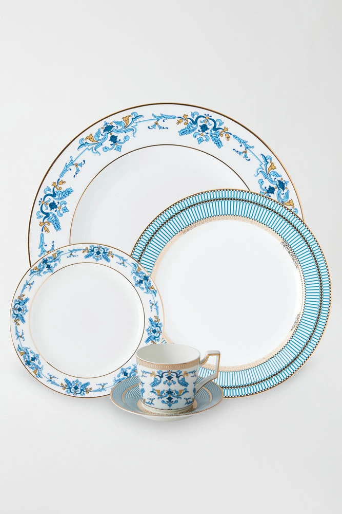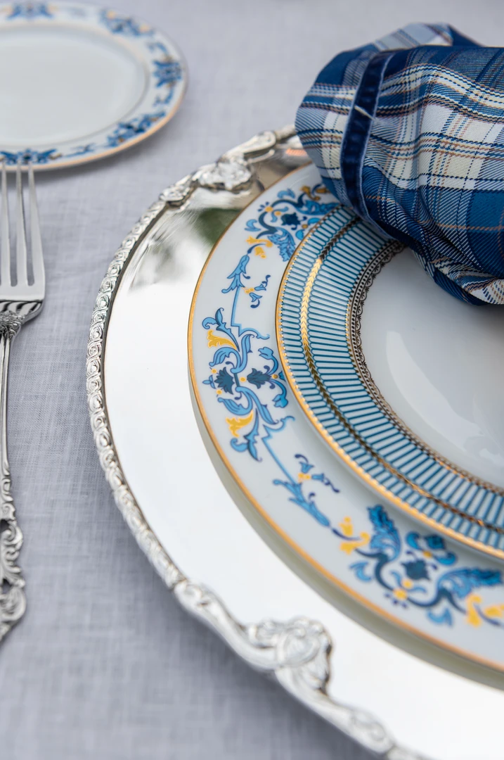 this elegant bone china dinner set is hand decorated with a deep blue and gold Louis XIV motif,