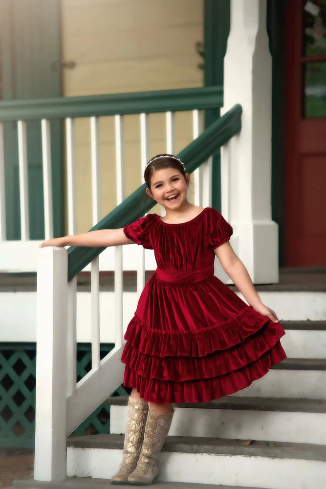 This soft, luxe burgundy velvet dress will have all eyes on her! Classic and twirly with ruffles galore, this heirloom piece will be passed down for generations to come. Fully lined with soft cotton, back zips. Machine wash, hang dry.