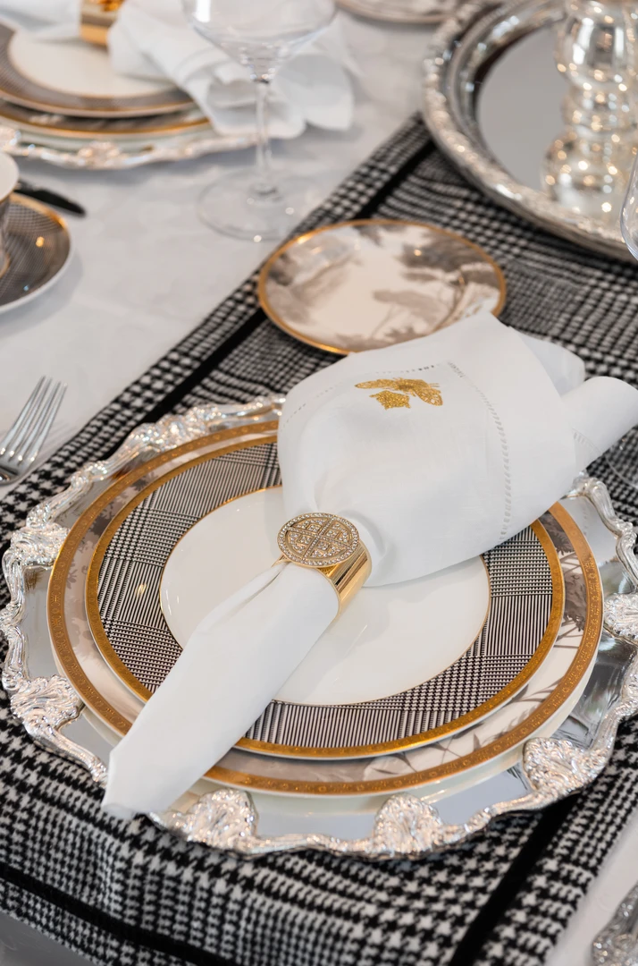 100% Italian linen hemstitch napkins are graced with a gold metallic bee. These luxury napkins will be a whimsical addition to your table! Pair with our queen bee napkin rings for a perfect finishing touch. 22″x22″ Machine wash, hot iron.