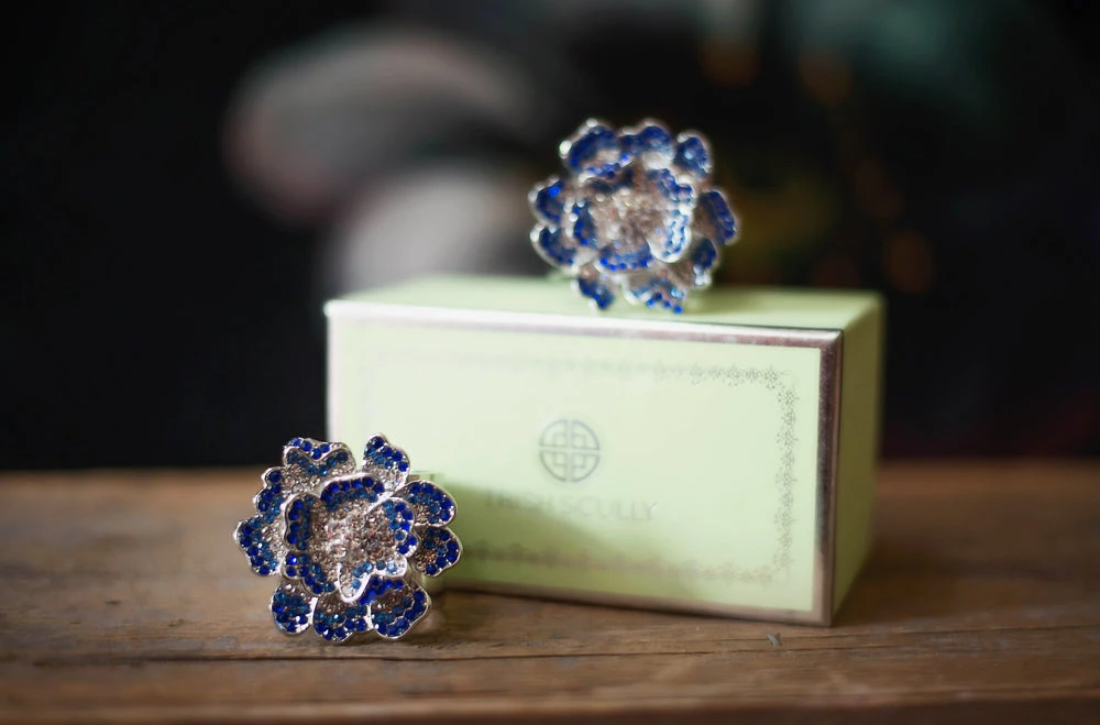 Bountiful and blue, these napkin rings will be the talk of your table! Inspired from a vintage, precious stone brooch, the details of this napkin ring set are stunning. From the pave jewels to the luxe silver plated details, this set comes complete with a keepsake storage box. These are special heirloom pieces that can be passed down from generation to generation. Truly a work of art.