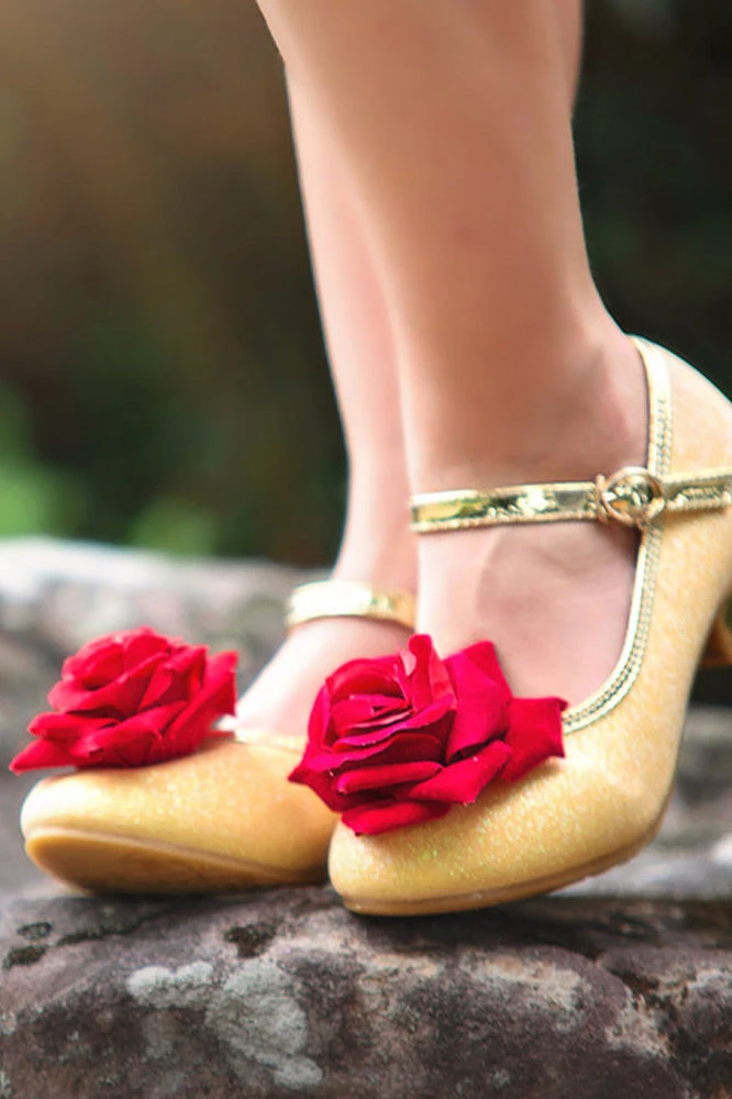 Let the imagination soar in these magical rose shoes! These yellow sparkly shoes are topped with a perfectly placed rose, for just the right touch of whimsy. Easy for little fingers to take on and off. Super comfy for tender feet, these shoes will have her twirling all day!