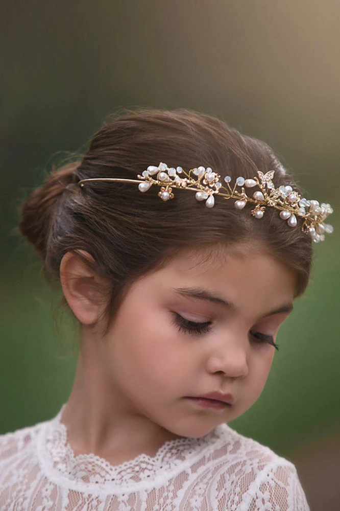 Adorable butterflies and pearls make up this golden touch of whimsy. A perfect companion to our dresses and a photographers dream to capture.