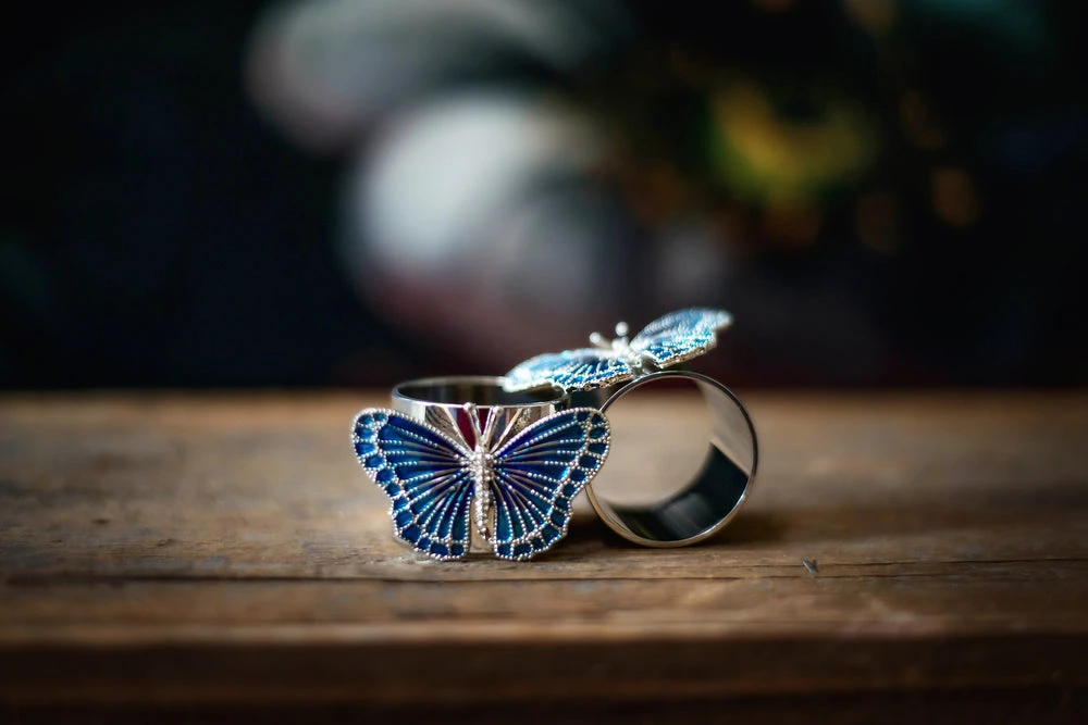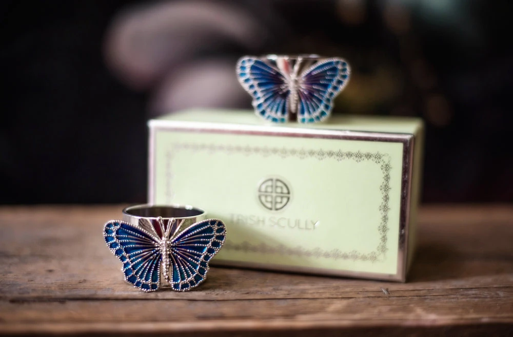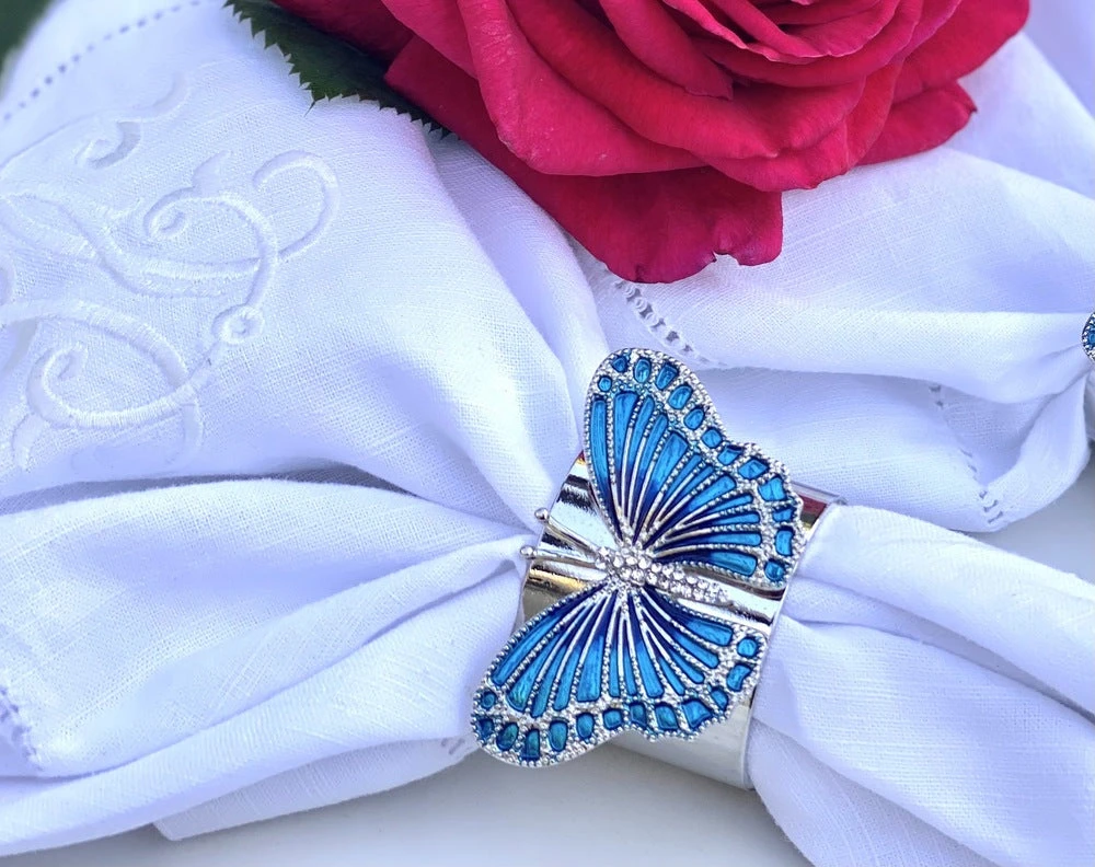 Flutter by butterfly! These napkin rings will be the talk of your table! Inspired from a vintage, precious stone brooch, the details of this napkin ring set are stunning. From the pave jewels to the silver plated details, this set comes complete with a keepsake storage box. These are special heirloom pieces that can be passed down from generation to generation. Truly a work of art.