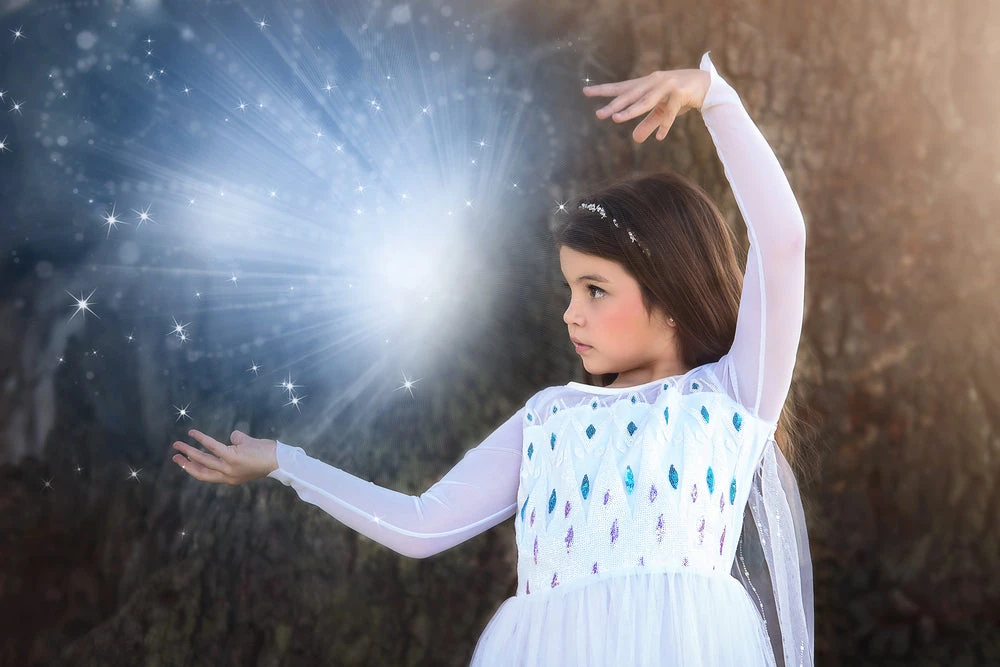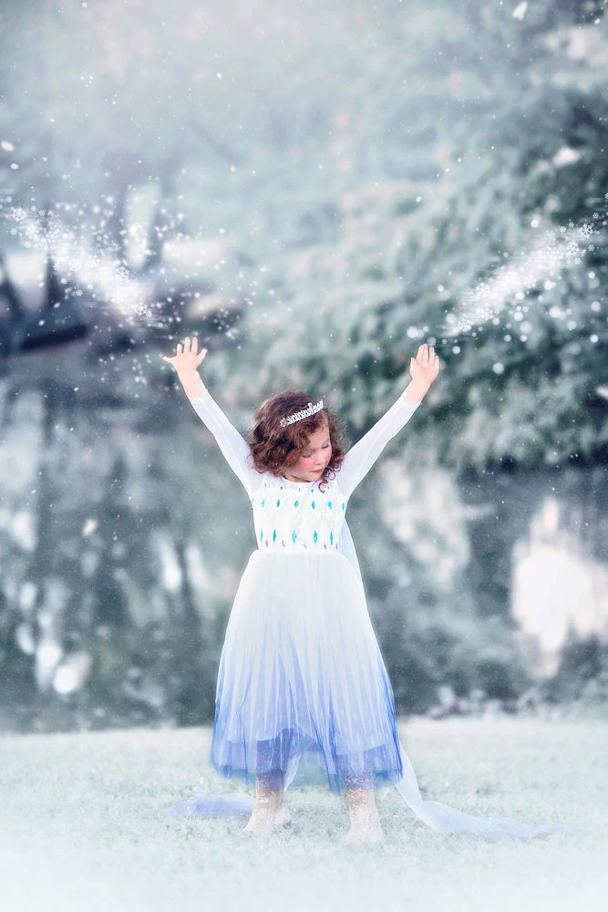 This magical gown will have her imagination soaring! Soft printed tulling with a hint of sparkle, this gown has it all. The regal jeweled cape finishes off her look. She will never want to take it off! Fully lined, totally soft and never any glitter. Elastic back. Machine wash, hang dry. DON’T FORGET HER MATCHING DOLL DRESS!