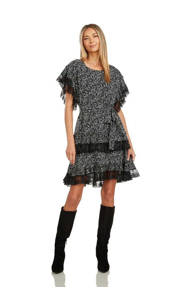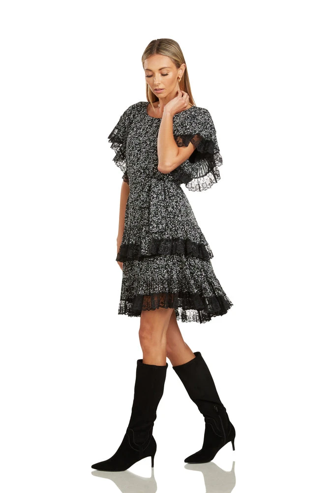This black and white floral chiffon dress has feminine ruffles graced with lace,