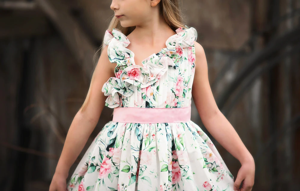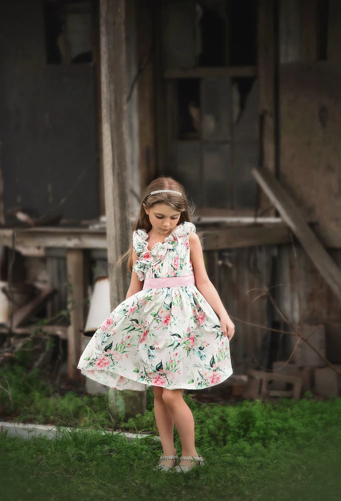 With a vintage-inspired ivory floral fabric and ruffles galore, this one is stunning both coming & going.