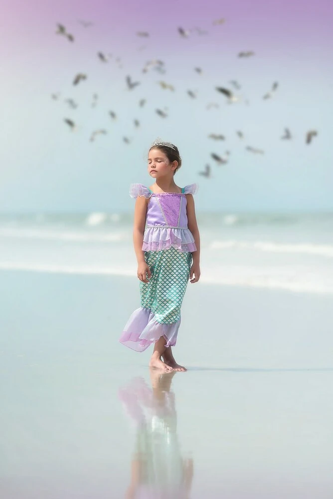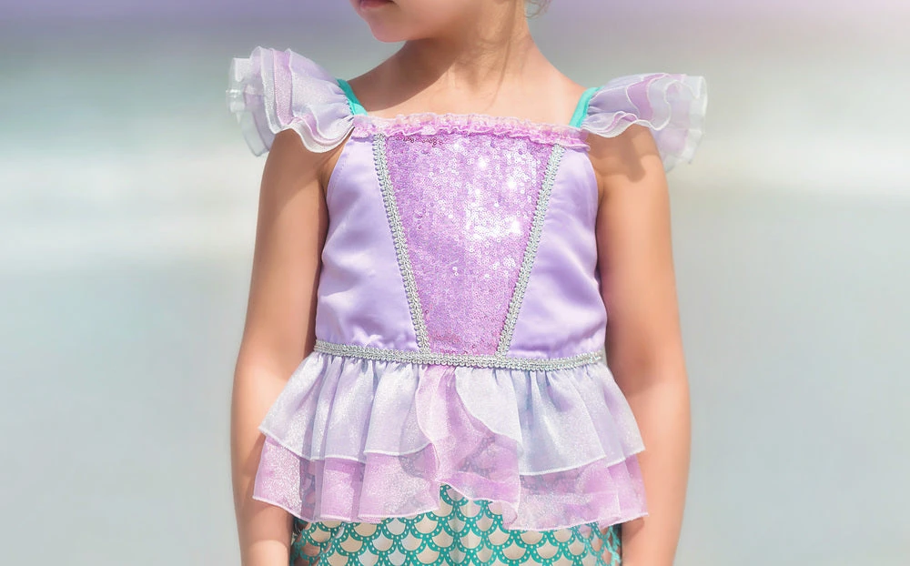 She will make a splash when she walks into the room wearing this adorable mermaid costume! Sparkly details grace the bodice, perfectly trimmed and finished with ruffles. The skirt fabric has sheen and sparkle, reminiscent of the finest mermaid tales! She will never want to take this off! As with all of our luxe dress up, our fabrics are always soft, never itchy and the easiest of care. 100% poly. Machine wash, hang dry.