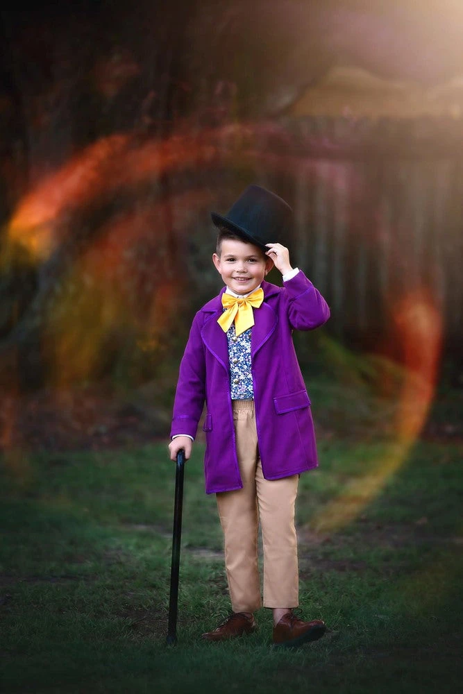 The 4pc. set consists of the purple coat, floral vest, pant and yellow bow tie.