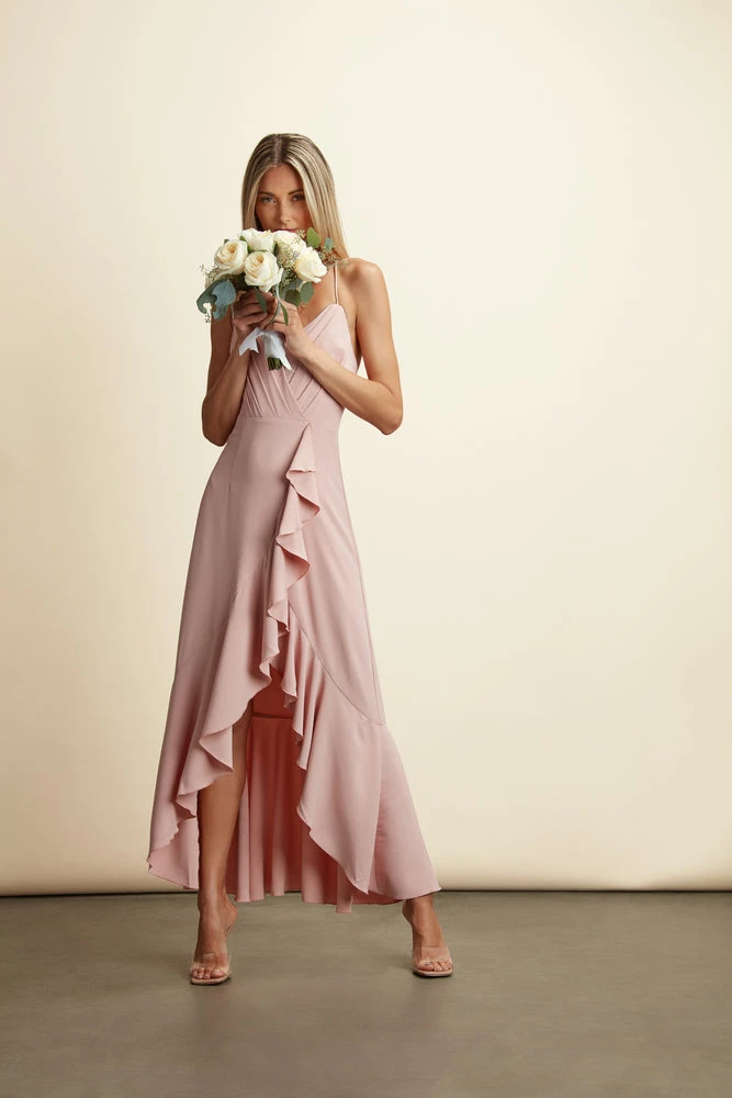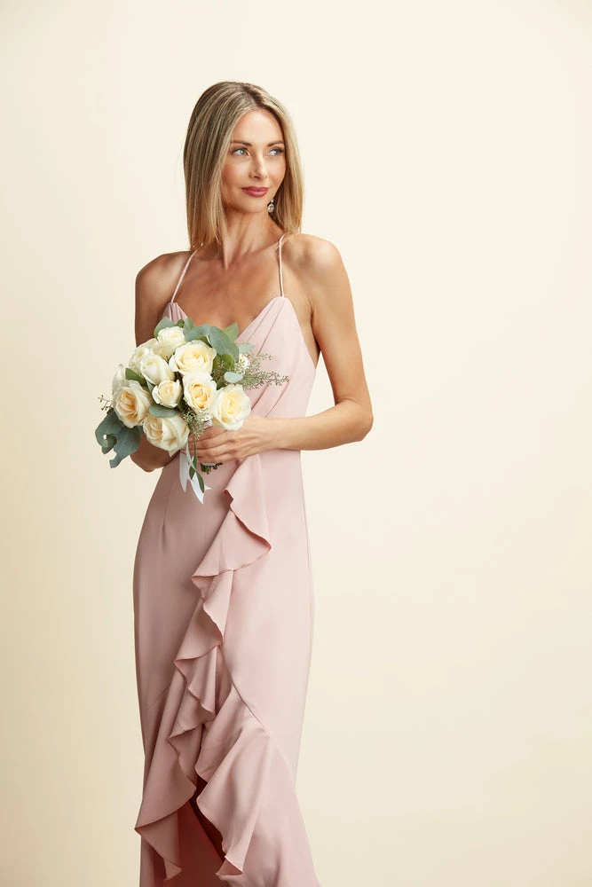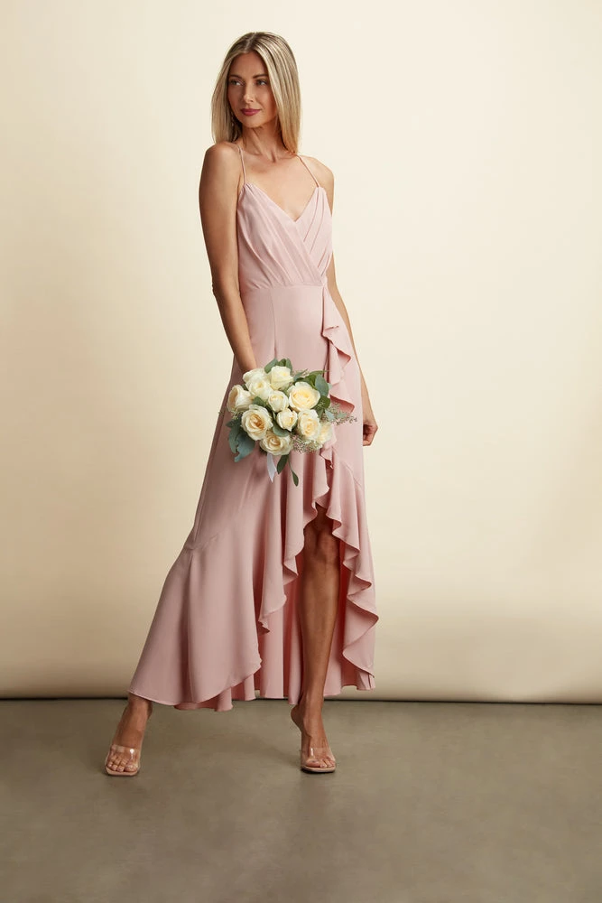 Make an entrance in this stunning gown! Perfect for a bridesmaid, a wedding guest, or for a fancy Summer brunch. Loose ruffles grace this hi-low skirt, complimented with a soft v-neckline, subtle pleats on the bodice and criss-cross straps. Fully lined, back zip. Dry clean only.