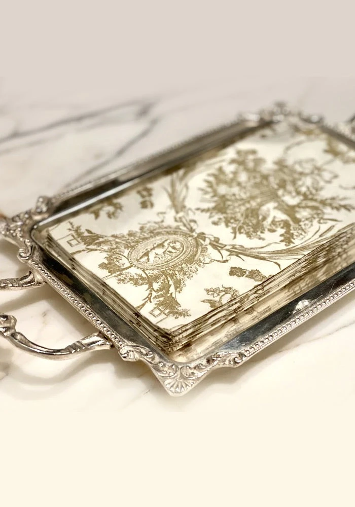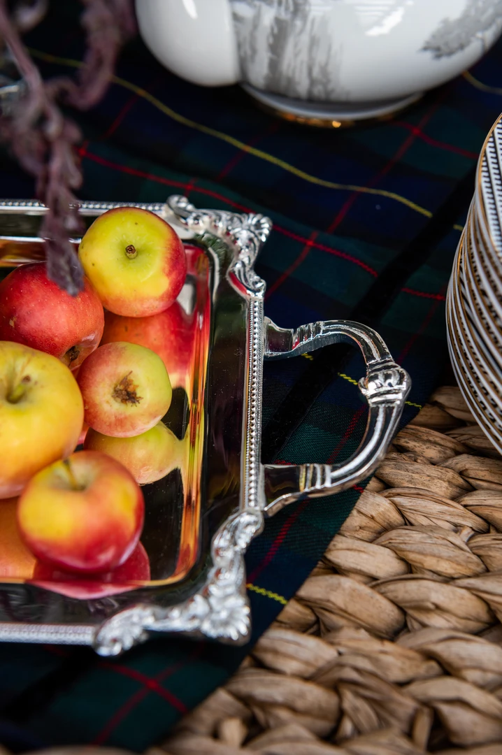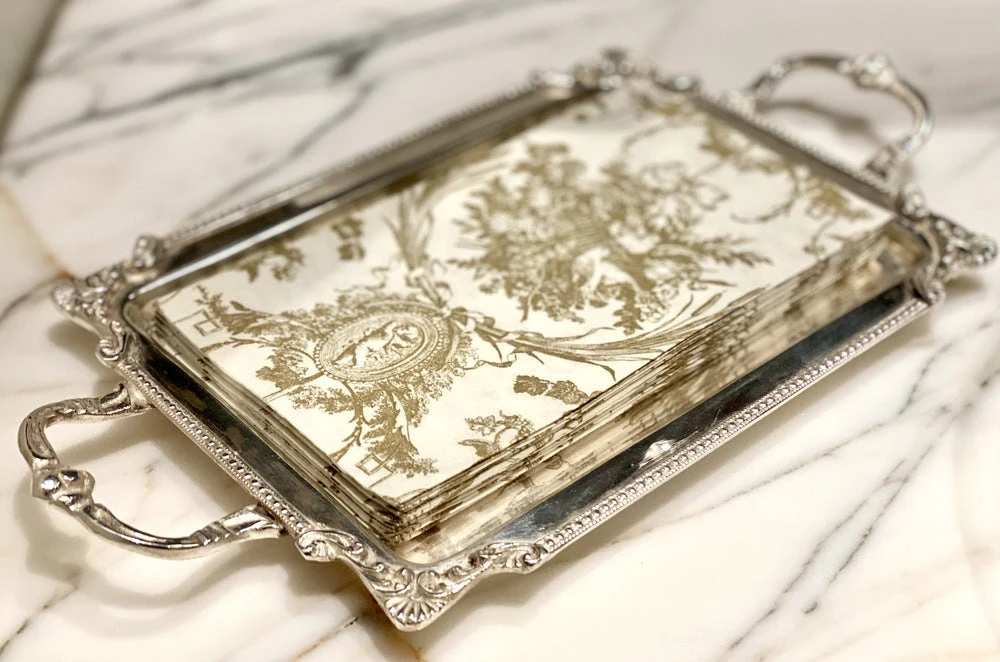 Oh so handsome and versatile, this tray is perfect for a powder bath vanity and will fit your favorite guest towels. Add one of our julep cups filled with flowers, your favorite hand soap and voila a presentation fit for royalty. Multiple microns of silver plating make for an incredibly durable and valuable piece, you won’t believe you paid so little for such luxury. 13″ long x 7″ wide