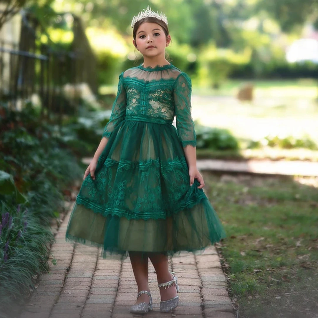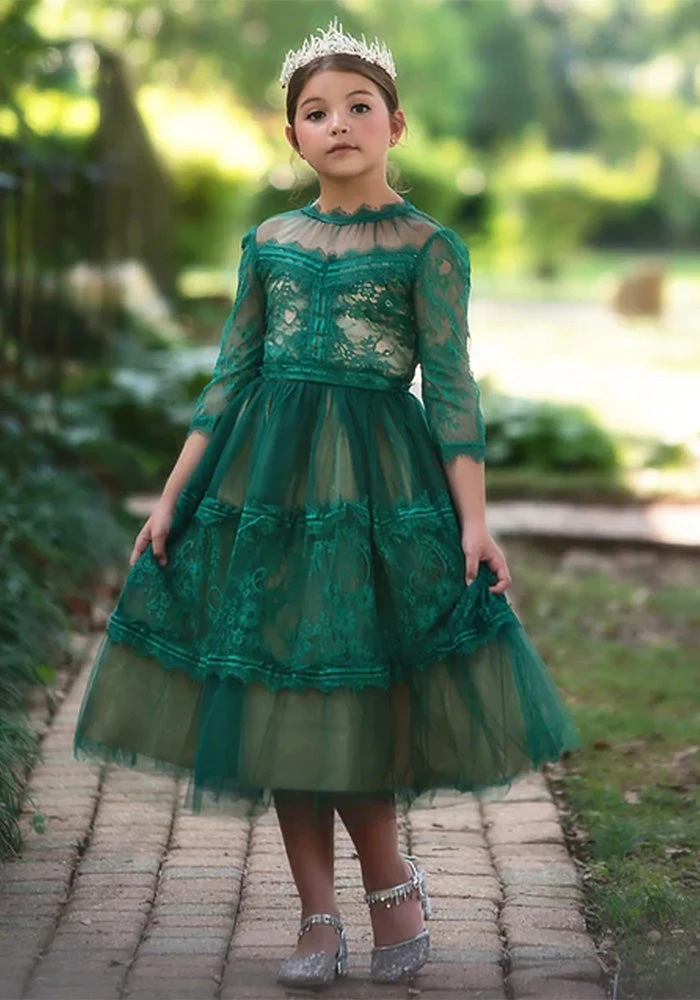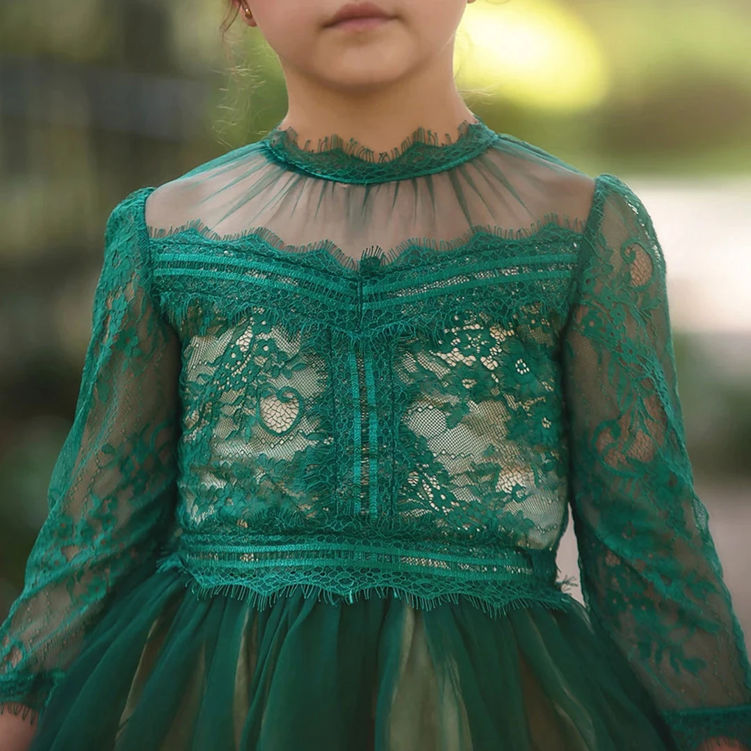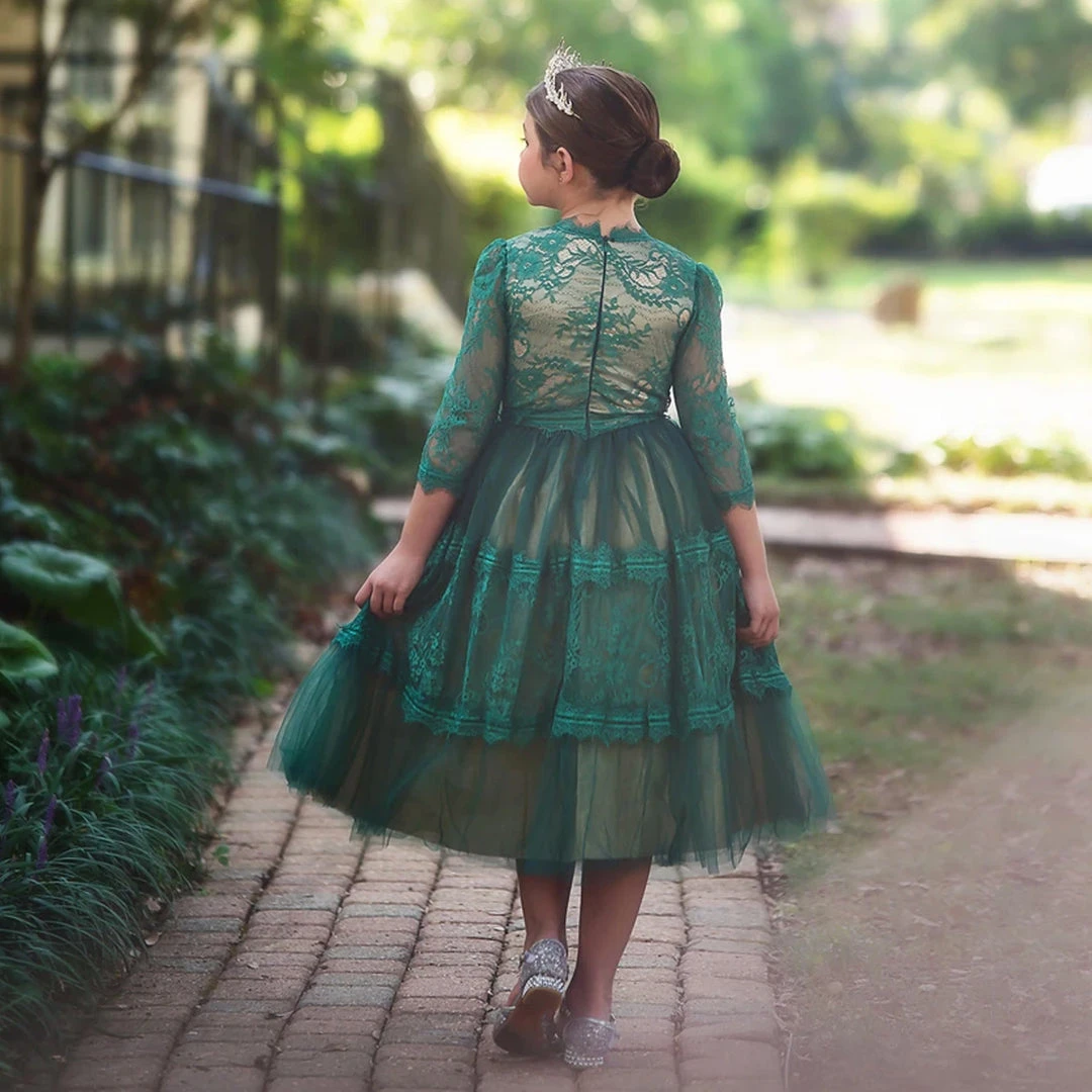 The gown of her dreams! The bodice & sleeves of this dress boast our signature soft-cotton lace, soft tulle yolk and are graced with elegant trimmings. The skirt has layers upon layers of tulle with elegant trims and designs, and a tan lining underneath for an extra hint of richness. Truly a keepsake piece! Fully lined with soft cotton. Machine wash, hang dry.